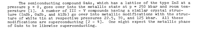 The semiconducting compound GaAs, which has a lattice of the type ZnS at pressure ρ = 0, goes over into the metallic state at ρ = 250 kbar and room tern perature [1]. A number of III V compounds having a similar crystal structure (InSb, GaSb, and AlSb) go over into metallic modifications with the struc ture of white tin at respective pressures 22.5, 70, and 125 kbar. All these modifications are superconducting [2-4]. One might expect the metallic phas of GaAs to be likewise superconducting.