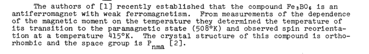 The authors of [1] recently established that the compound Fe3B06 is an antiferromagnet with weak ferromagnetlsm. Prom measurements of the dependence of the magnetic moment on the temperature they determined the temperature of its transition to the paramagnetic state (508°K) and observed spin reorientation at a temperature 4l5°K. The crystal structure of this compound is ortho-rhombic and the space group is Ρ [2].