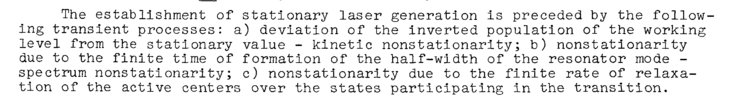 The establishment of stationary laser generation is preceded by the following transient processes: a) deviation of the inverted population of the working level from the stationary value kinetic nonstationarity; b) nonstationarity due to the finite time of formation of the half-width of the resonator mode -spectrum nonstationarity; c) nonstationarity due to the finite rate of relaxation of the active centers over the states participating in the transition.