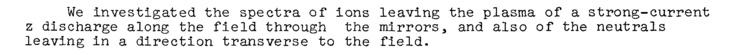 We investigated the spectra of ions leaving the plasma of a strong-current ζ discharge along the field through the mirrors, and also of the neutrals leaving in a direction transverse to the field.