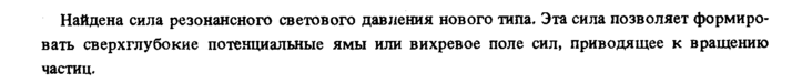 Найдена сила резонансного светового давления нового типа. Эта сила позволяет формировать сверхглубокие потенциальные ямы или вихревое поле сил, приводящее к вращению частиц.