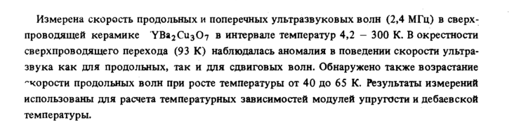 Измерена скорость продольных и поперечных ультразвуковых волн (2,4 МГц) в сверхпроводящей керамике УВа2Сиз07 в интервале температур 4,2 300 К. В окрестности сверхпроводящего перехода (93 К) наблюдалась аномалия в поведении скорости ультразвука как для продольных, так и для сдвиговых волн. Обнаружено также возрастание "корости продольных волн при росте температуры от 40 до 65 К. Результаты измерений использованы для расчета температурных зависимостей модулей упругости и дебаевской температуры.