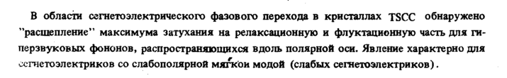В области сегнетоэлектрического фазового перехода в кристаллах TSCC обнаружено "расшепление" максимума затухания на релаксационную и флуктационную часть для гиперзвуковых фононов, распространяющихся вдоль полярной оси. Явление характерно для сегнетоэлектриков со слабополярной мягкой модой (слабых сегнетоэлектриков).