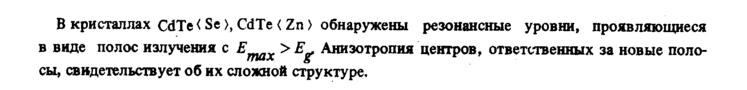 В кристаллах CdTe< Se), CdTe < Zn) обнаружены резонансные уровни, проявляющиеся в виде полос излучения с > Е^ Анизотропия центров, ответственных за новые поло- сы, свидетельствует об их сложной структуре.