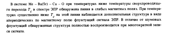 В системе Me Ba(Sr) Си О при температурах ниже температуры сверхпроводящего перехода Тс в спектре ЭПР обнаружена линия в слабых магнитных полях. При температурах существенно ниже Τ на этой линии наблюдается дополнительная структура в виде апериодических по магнитному полю флуктуаций сигнала ЭПР. В отличие от шумовых флуктуаций обнаруженная структура полностью воспроизводится при многократной записи сигнала.