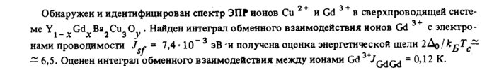 Обнаружен и идентифицирован спектр ЭПР ионов Cu2+ и Gd 3 + в сверхпроводящей системе Υ _ Gd Ва Си О . Найден интеграл обменного взаимодействия ионов Gd 3+ с электро- I Λ Λ it j у нами проводимости J f = 7,4 · 10" 3 эВ и получена оценка энергетической щели 2Д>/ ккТ ~ sj η с — 6,5. Оценен интеграл обменного взаимодействия между ионами Gd Jr-dc*\ = 0Д2 К.