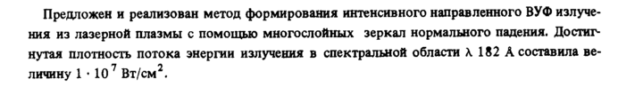 Предложен и реализован метод формирования интенсивного направленного ВУФ излучения из лазерной плазмы с помощью многослойных зеркал нормального падения. Достигнутая плотность потока энергии излучения в спектральной области λ 182 А составила величину 1 · 10 7 Вт/см2.