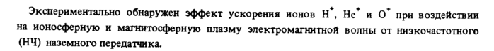 Экспериментально обнаружен эффект ускорения ионов Н*, Не+ и 0+ при воздействии на ионосферную и магнитосферную плазму электромагнитной волны от низкочастотного (НЧ) наземного передатчика.