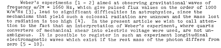 Weber's experiments [1 2] aimed at observing gravitational'waves of frequency ω/2π = 1бб0 Hz, which give pulsed flux values on the order of 1000 W/m Hz [335 lead to significant difficulties in astrophysics, since the mechanisms that yield such a colossal radiation are unknown and the mass lost to radiation is too high [4]. In the present article we wish to call attention to the fact that an interpretation of Weber's experiment, where quartz converters of mechanical shear into electric voltage were used, are not unambiguous. It is possible to register in such an experiment longitudinal electromagnetic waves which exist if the rest mass of the photon differs from zero [5 10].