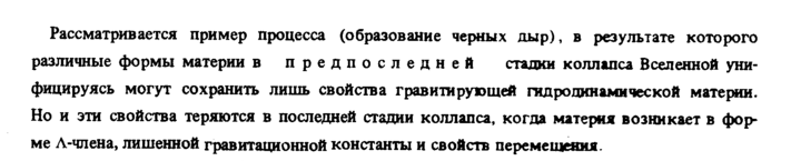 Рассматривается пример процесса (образование черных дыр), в результате которого различные формы материи в предпоследней стадки коллапса Вселенной унифицируясь могут сохранить лишь свойства гравитирующей гидродинамической материи. Но и эти свойства теряются в последней стадии коллапса, когда материя возникает в форме Л-члена, лишенной гравитационной константы и свойств перемещения.