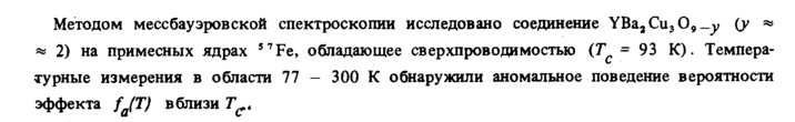 Методом мессбауэровской спектроскопии исследовано соединение YBa3Cu309_jy {у * « 2) на примесных ядрах 57Fe, обладающее сверхпроводимостью (Хс = 93 К). Температурные измерения в области 77 300 К обнаружили аномальное поведение вероятности эффекта fJT) вблизи Г^,