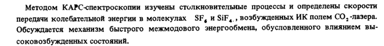 Методом КАРС-спектроскопии изучены столкновительные процессы и определены скорости передачи колебательной энергии в молекулах SF, и SiF4,, возбужденных ИК полем С02-лазера. Обсуждается механизм быстрого межмодового энергообмена, обусловленного влиянием высоковозбужденных состояний.