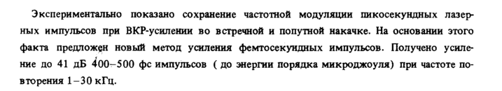 Экспериментально показано сохранение частотной модуляции пикосекундных лазерных импульсов при ВКР-усилении во встречной и попутной накачке. На основании этого факта предложен новый метод усиления фемто секундных импульсов. Получено у сил е-ние до 41 дБ 400-500 фс импульсов ( до энергии порядка микроджоуля) при частоте повторения 1-30 кГц.