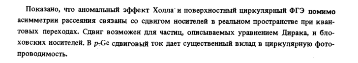 Показано, что аномальный эффект Холла' и поверхностный циркулярный ФГЭ помимо асимметрии рассеяния связаны со сдвигом носителей в реальном пространстве при квантовых переходах. Сдвиг возможен для частиц, описываемых уравнением Дирака, и бло-ховских носителей. В p-Ge сдвиговый ток дает существенный вклад в циркулярную фотопроводимость.