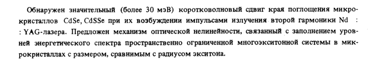 Обнаружен значительный (более 30 мэВ) коротковолновый сдвиг края поглощения микрокристаллов CdSe, CdSSe при их возбуждении импульсами излучения второй гармоники Nd : : YAG-лазера. Предложен механизм оптической нелинейности, связанный с заполнением уровней энергетического спектра пространственно ограниченной многоэкситонной системы в микрокристаллах с размером, сравнимым с радиусом экситона.
