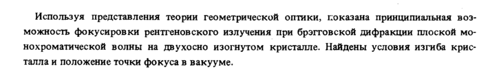 Используя представления теории геометрической оптики, показана принципиальная возможность фокусировки рентгеновского излучения при брэгтовской дифракции плоской монохроматической волны на двухосно изогнутом кристалле. Найдены условия изгиба кристалла и положение точки фокуса в вакууме.
