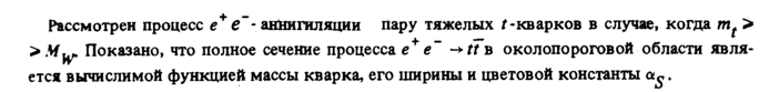 Рассмотрен процесс e+ e~~ аннигиляции пару тяжелых г-кварков в случае, когда т( > >MUf. Показано, что полное сечение процесса е+ е~ ->Мв околопороговой области явля- It ется вычислимой функцией массы кварка, его ширины и цветовой константы Оу.