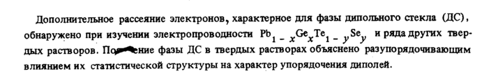 Дополнительное рассеяние электронов, характерное для фазы дипольного стекла (ДС), обнаружено при изучении электропроводности PbJ _ χ^χΤ&1 у^еу и ряда других твердых растворов. По^^ение фазы ДС в твердых растворах объяснено разупорядочивающим влиянием их статистической структуры на характер упорядочения диполей.