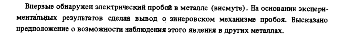 Впервые обнаружен электрический пробой в металле (висмуте). На основании экспериментальных результатов сделан вывод о зинеровском механизме пробоя. Высказано предположение о возможности наблюдения этого явления в других металлах.