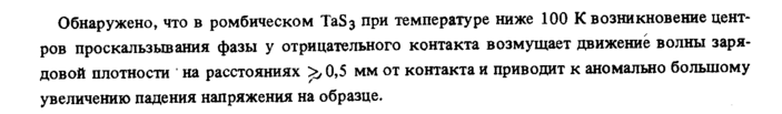 Обнаружено, что в ромбическом TaS3 при температуре ниже 100 К возникновение центров проскальзывания фазы у отрицательного контакта возмущает движение волны зарядовой плотности на расстояниях £/0,5 мм от контакта и приводит к аномально большому увеличению падения напряжения на образце.