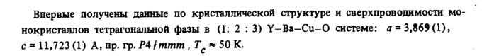 Впервые получены данные по кристаллической структуре и сверхпроводимости мо нокристаллов тетрагональной фазы в (1: 2 : 3) Y-Ba-Cu-Ο системе: а = 3,869(1), с = 11,723(1) А, пр. rp.P4fmmm, Г, * 50 К.