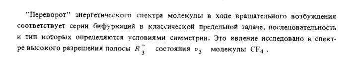 "Переворот" энергетического спектра молекулы в ходе вращательного возбуждения соответствует серии бифуркаций в классической предельной задаче, последовательность и тип которых определяются условиями симметрии. Это явление исследовано в спектре высокого разрешения полосы R ~ состояния v3 молекулы CF4 .