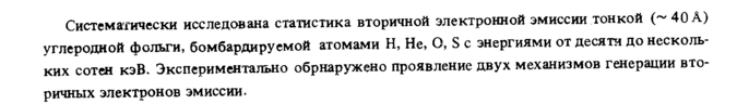Систематически исследована статистика вторичной электронной эмиссии тонкой (~ 40 А) углеродной фольги, бомбардируемой атомами Н, Не, О, S с энергиями от десяти до нескольких сотен кэВ. Экспериментально обрнаружено проявление двух механизмов генерации вторичных электронов эмиссии.