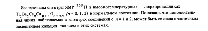 Исследованы спектры ЯМР 205Т1 в высокотемпературных сверхпроводниках Т1 Кя Га Си О in О, 1» 2) в нормальном состоянии. Показано, что дополнитель2 2 П Λ+1 6+2И 1 ная линия, наблюдаемая в спектрах соединений с п=1и2, может быть связана с частичным замещением кальция таллием в этих системах.