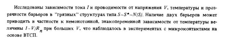 Исследованы зависимости тока / и проводимости от напряжения V, температуры и прозрачности барьеров в "грязных" структурах типа S~S*~N(S), Наличие двух барьеров может приводить в частности к немонотонной, знакопеременной зависимости от температуры величины I-V/R^ при больших V, что наблюдалось в экспериментах с микроконтактами на основе ВТСП.