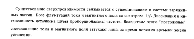 Существование сверхпроводимости связывается с существованием в системе заряженных частиц Бозе флуктуаций тока и магнитного поля со спектром 1//. Диссипация и интенсивность источника шума пропорциональны частоте. Вследствие этого "постоянные" составляющие тока и магнитного поля затухают лишь за время порядка времени жизни установки.