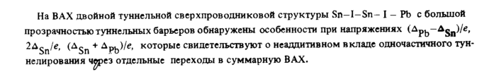 На ΒΑΧ двойной туннельной сверхпроводниковой структуры Sn-I-SnI РЬ с большой прозрачностью туннельных барьеров обнаружены особенности при напряжениях (Δρ^_Δδη^€' ^Sn'e' ^Sn + А?Ъ^е' котоРЬ1е свидетельствуют о неаддитивном вкладе одночастичного тун-нелирования через отдельные переходы в суммарную ΒΑΧ.