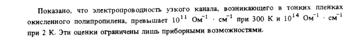 Показано, что электропроводность узкого канала, возникающего в тонких пленках окисленного полипропилена, превышает 10й Ом 1 · см при 300 К и 10 Ом 1 ■ см при 2 К. Эти оценки ограничены лишь приборными возможностями.