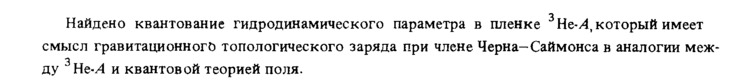 Найдено квантование гидродинамического параметра в пленке Не-/4, который имеет смысл гравитационного топологического заряда при члене Черна— Саймонса в аналогии между 3Не-/4 и квантовой теорией поля.