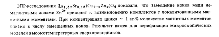 ЭПР-исследования Lat $2^0.18(Сиι-*Ζη*)°4 показали, что замещение ионов меди немагнитными ионами Zn2* приводит к возникновению комплексов с локализованными магнитными моментами. При концентрациях цинка ~ 1 ат.% количество магнитных моментов близко к числу замещенных ионов. Результат важен для верификации микроскопических моделей высокотемпературных сверхпроводников.