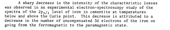 A sharp decrease in the intensity of the characteristic losses was observed in an experimental electron-spectroscopy study of the spectra of the 2p3/2 level of iron in cementite at temperatures below and above the Curie point. This decrease is attributed to a decrease in the number of uncompensated 3d electrons of the iron on going from the ferromagnetic to the paramagnetic state.