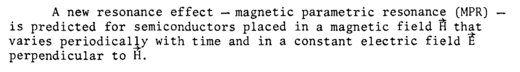 A new resonance effect — magnetic parametric resonance (MPR) — is predicted for semiconductors placed in a magnetic field Η that varies periodically with time and in a constant electric field ? perpendicular to H.