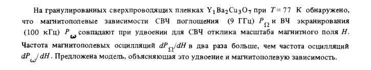 На гранулированных сверхпроводящих пленках ΎιΒ^^^Οη при Т11 К обнаружено, что магнитополевые зависимости СВЧ поглощения (9 ГГц) Р^ и ВЧ экранирования (100 кГц) Р^ совпадают при удвоении для СВЧ отклика масштаба магнитного поля Я. Частота магнитополевых осцилляций dP^/dH в два раза больше, чем частота осцилляций dP I dH. Предложена модель, объясняющая это удвоение и магнитополевую зависимость.