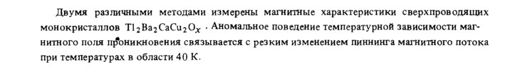 Двумя различными методами измерены магнитные характеристики сверхпроводящих монокристаллов Т12Ва2СаСи2Ох · Аномальное поведение температурной зависимости магнитного поля проникновения связывается с резким изменением пиннинга магнитного потока при температурах в области 40 К.