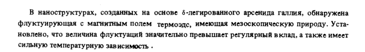 В наноструктурах, созданных на основе δ-легированного арсенида галлия, обнаружена флуктуирующая с магнитным полем термоэдс, имеющая мезоскопическую природу. Установлено, что величина флуктуации значительно превышает регулярный вклад, а также имеет сильную температурную зависимость .