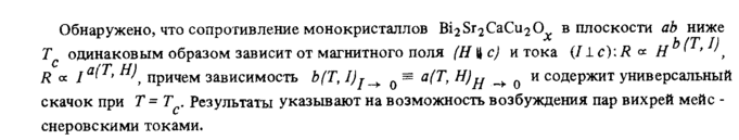 Обнаружено, что сопротивление монокристаллов I^S^CaCu^O^. в плоскости аЪ ниже 7' одинаковым образом зависит от магнитного поля (Н Ц с) и тока (/lc):R « Н^^' ^, R α la(T> Н)} причем зависимость b(T, Ijj^ s а(Т, Н)н ^ Q и содержит универсальный скачок при Т = Τ , Результаты указывают на возможность возбуждения пар вихрей мейс -снеровскими токами.