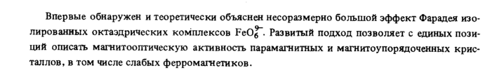 Впервые обнаружен и теоретически объяснен несоразмерно большой эффект Фарадея изолированных октаэдрических комплексов FeO|~. Развитый подход позволяет с единых позиций описать магнитооптическую активность парамагнитных и магннеупорядоченных кристаллов, в том числе слабых ферромагнетиков.