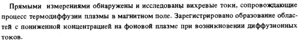 Прямыми измерениями обнаружены и исследованы вихревые токи, сопровождающие процесс термодиффузии плазмы в магнитном поле. Зарегистрировано образование областей с пониженной концентрацией на фоновой плазме при возникновении диффузионных токов.