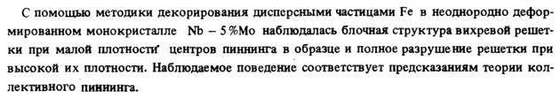 С помощью методики декорирования дисперсными частицами Fe в неоднородно деформированном монокристалле Nb 5 %Мо наблюдалась блочная структура вихревой решетки при малой плотносит* центров пиннинга в образце и полное разрушение решетки при высокой их плотности. Наблюдаемое поведение соответствует предсказаниям теории коллективного пиннинга.