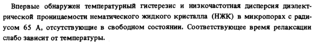 Впервые обнаружен температурный гистерезис и низкочастотная дисперсия диэлектрической проницаемости нематического жидкого кристалла (НЖК) в микропорах с радиусом 65 А, отсутствующие в свободном состоянии. Соответствующее время релаксации слабо зависит от температуры.