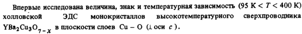 Впервые исследована величина, знак и температурная зависимость (95 К < Τ < 400 К) холловской ЭДС монокристаллов высокотемпературного сверхпроводника YBa2Cu30 в плоскости слоев Си О (1 оси с ).