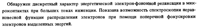 Обнаружен дискретный характер энергетической электрон-фононной релаксации в микроконтактах при больших токах инжекции. Показана возможность спектроскопии неравновесной функции распределения электронов при помощи поперечной фокусировки электронов выделенных энергий.