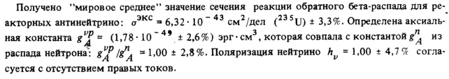 Получено "мировое среднее" значение сечения реакции обратного бета-распада для реакторных антинейтрино: аЭКС =» 6,32 · 10 " 43 см2/дел (235U) ± 3,3%. Определена аксиальная константа gpJ = (1,78-10~4'.+ 2,6%) эрг*см3, которая совпала с константой^ из распада нейтрона": gv£ /gnA =1,00 ± 2,8%. Поляризация нейтрино hy = 1,00 ± 4,7% согласуется с отсутствием правых токов.