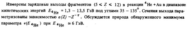 Измерены зарядовые выходы фрагментов (5 < Ζ < 12) в реакции Не +Аи в диапазоне кинетических энергий #4не = А>3 13,5 ГэВ под углами 35 135°. Сечения выхода параметризованы зависимостью o(Z) ~Z~r. Обсуждается природа обнаруженного минимума параметра т(Е 4„ ) при F4h 6 ГэВ.