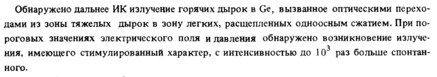 Обнаружено дальнее ИК излучение горячих дырок в Ge, вызванное оптическими переходами из зоны тяжелых дырок в зону легких, расщепленных одноосным сжатием. При пороговых значениях электрического поля и давления обнаружено возникновение излучения, имеющего стимулированный характер, с интенсивностью до 103 раз больше спонтанного.