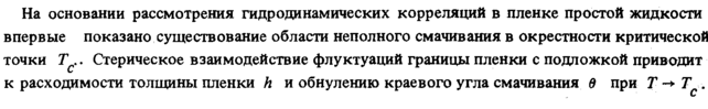 На основании рассмотрения гидродинамических корреляций в пленке простой жидкости впервые показано существование области неполного смачивания в окрестности критической точки ТТ.. Стерическое взаимодействие флуктуаций границы пленки с подложкой приводит к расходимости толщины пленки И и обнулению краевого угла смачивания θ при Τ -* Τ .